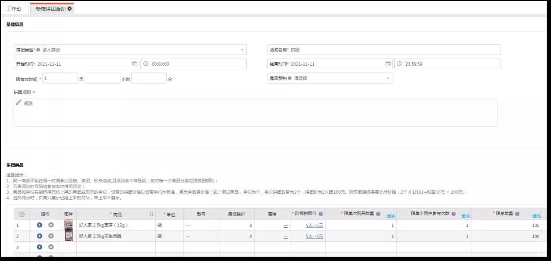 设置拼团活动,点击[营销]—[商城营销]—[商城拼团]新增,首先输入拼团类型,拼团类型可选择多人拼团或按购买商品总数量拼团,然后输入活动名称、时间、团购有效期和规则说明,并选择参与拼团的商品即可。
